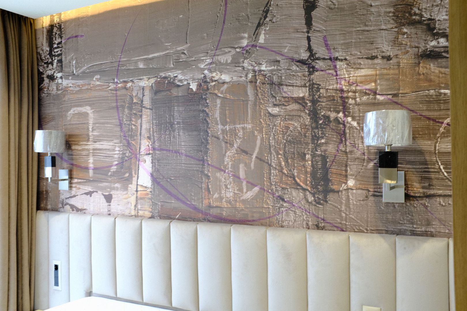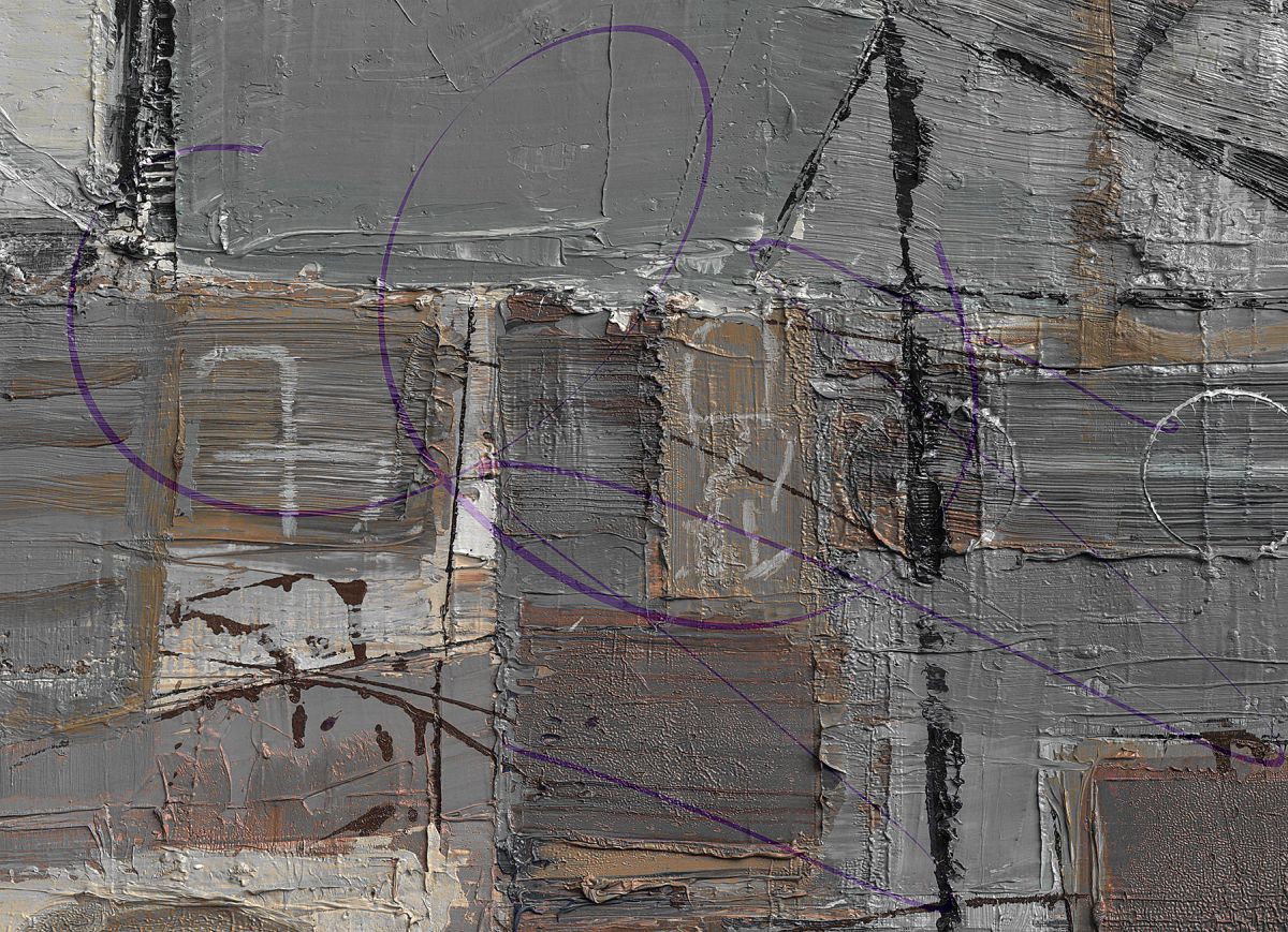 Композицията на този дизайнерски тапет с артистични монохромни масивни структури с маслени бои е шикозно допълнение към всеки водерен интериор.