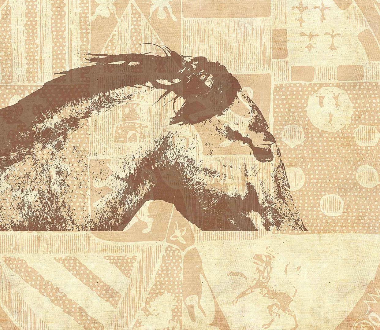 Във фокуса на този дизайнерски тапет е визията е на глава на кон в края на оспорвано състезание с разрошена грива и уморен поглед на фона на фигурални елементи с етно нотки.