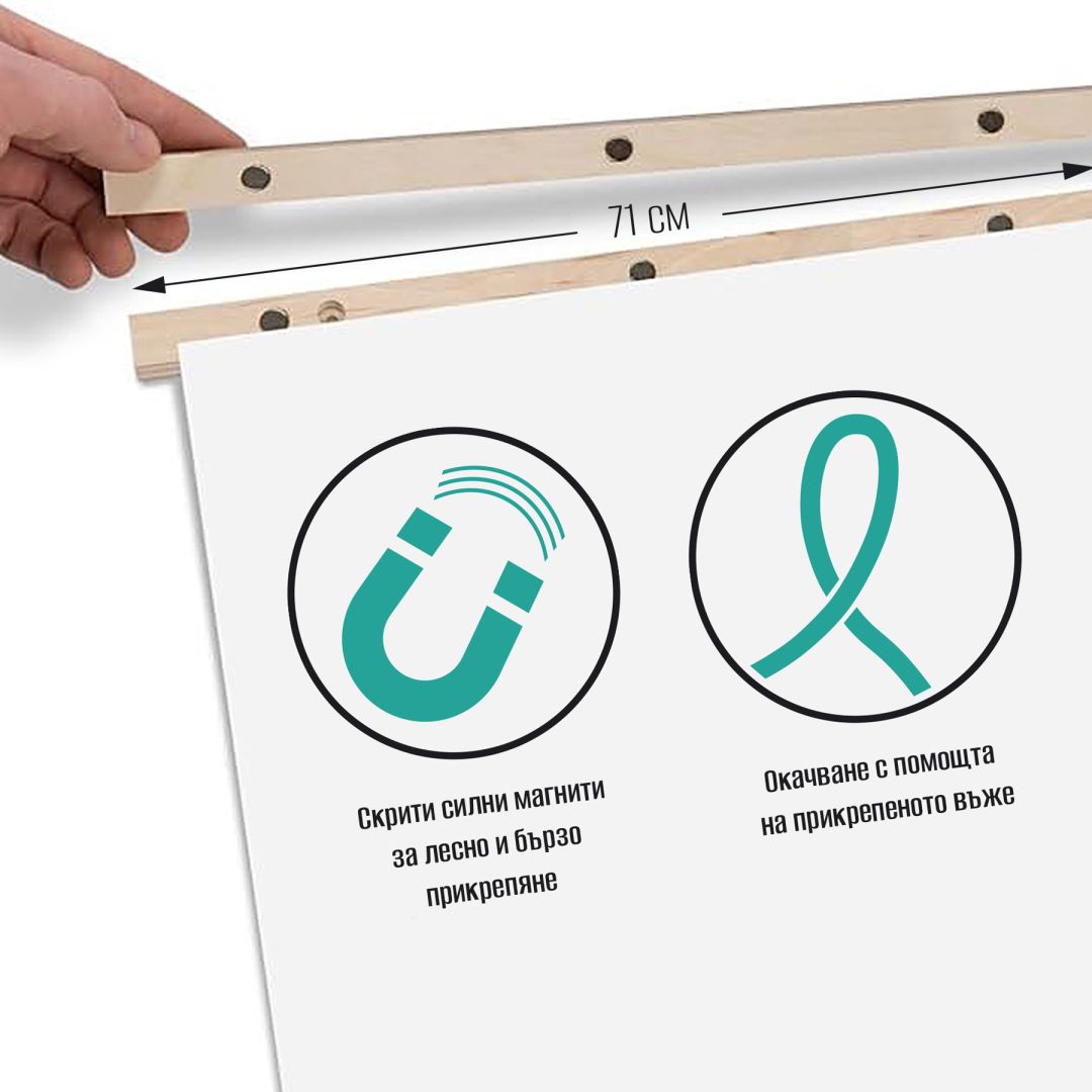 Комплект от 2бр. дървени лайсни с магнитно захващане и въженце за окачване на стена на постери, ширина - 71см, цвят - натурално дърво
