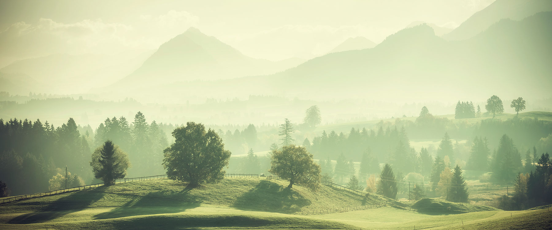 Тапетът е снимка на планински пейзаж с поляна и борове на преден план, обгърнати в мъгла след преминалия дъжд. Визията създава усещане за свобода, спокойствие и хармония.