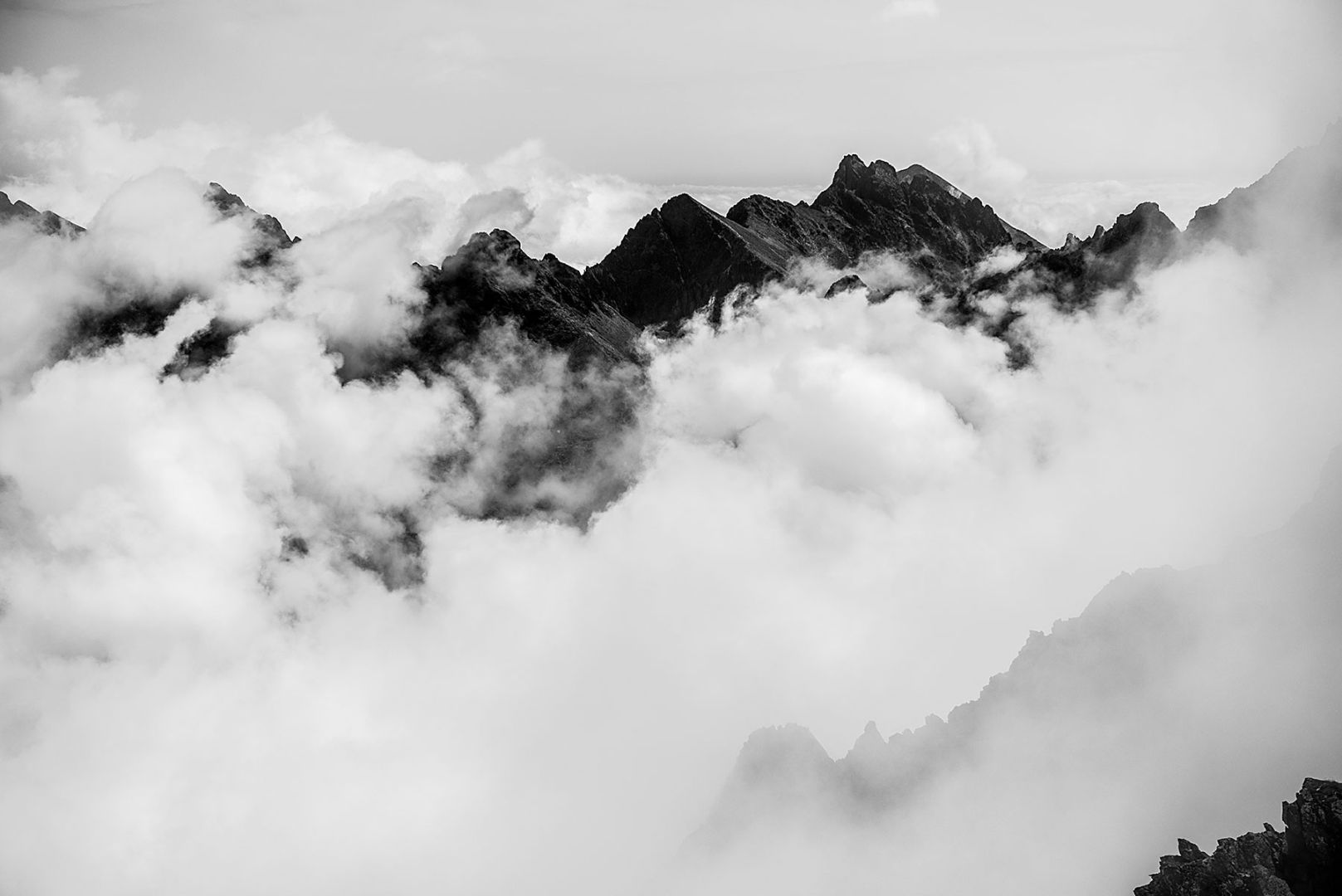 Тази черно-бяла снимка на обгърнати в облаците скалисти планински върхове създава простор и носи хармония и елегантност в интериора.