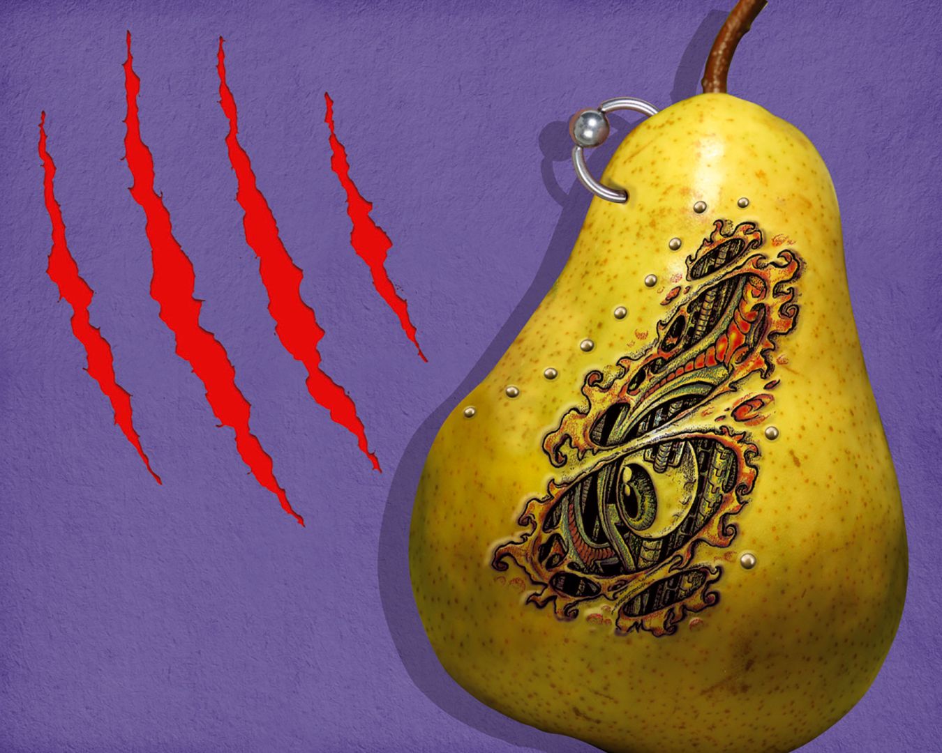 Композиция с татуирана круша, с пиърсинги и следи от нокти на страшен звяр по стената.