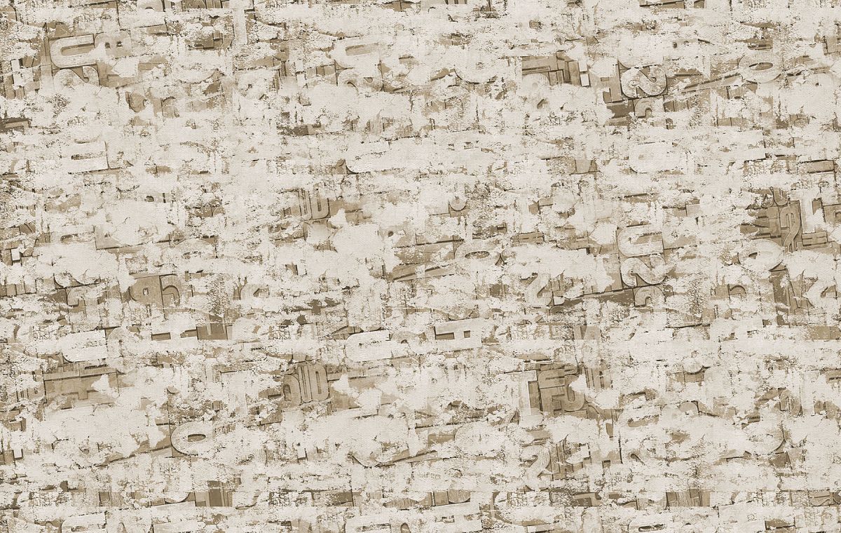 Дизайн с триизмерен ефект, където под грубо напластена гладка мазилка прозират масивни букви, напомнящи части от стена на стара фабрика, замазани с нови пластове бяла боя.