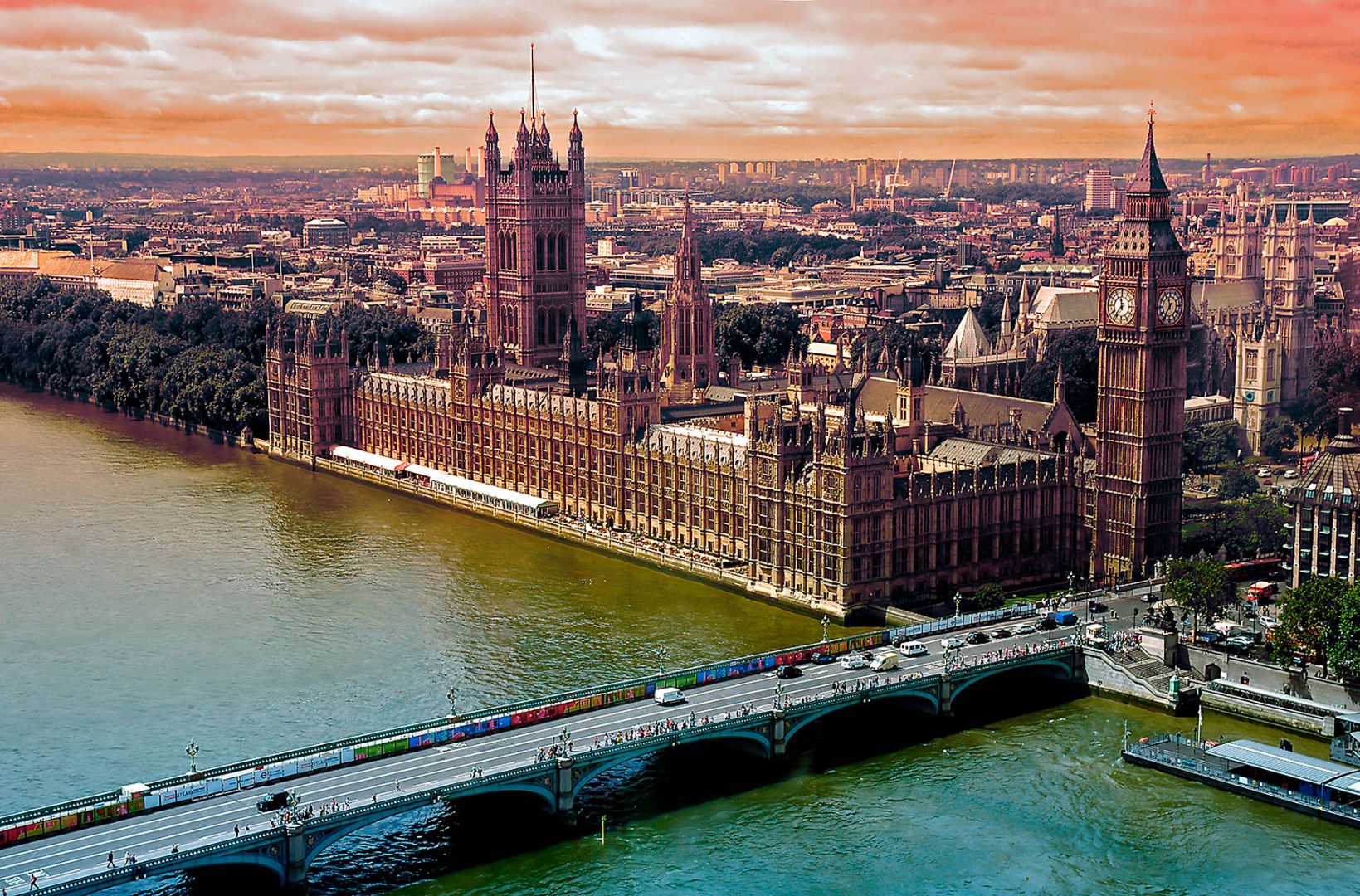 Фото тапет с визия на Парламентът на Лондон през лятото, облян от топлите лъчи на слънцето и далечен, летен хоризонт. Луксозен фототапет, който разширява пространството. Модерен дизайн подходящ за офис, хол и обществени пространства.