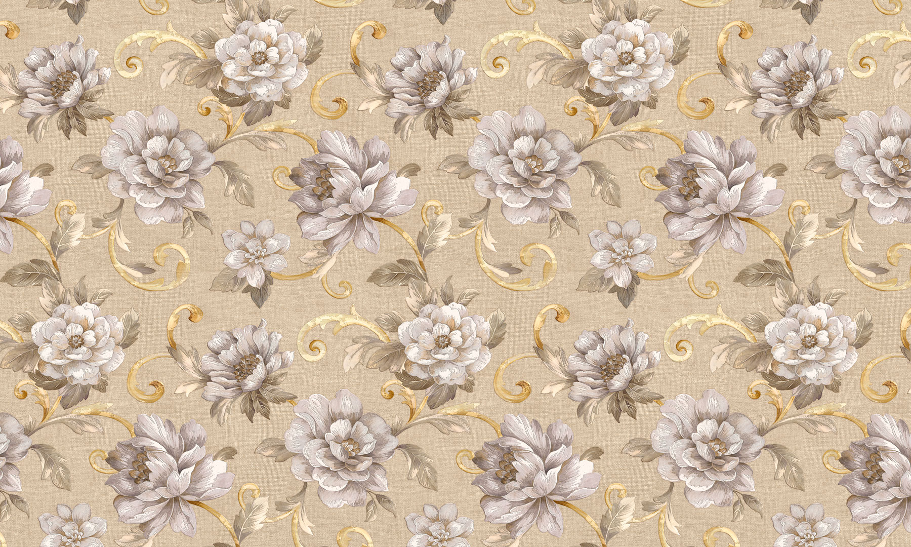 Флоралният дизайн на този тапет на основата на божури и рози залага на романтичната стилистика от края на 19 век и придава елегантен вид на пространството, където изберете да бъде поставен. Ако изберетe златна основа за печат, визията ще бъде още по-класна и въздействаща.