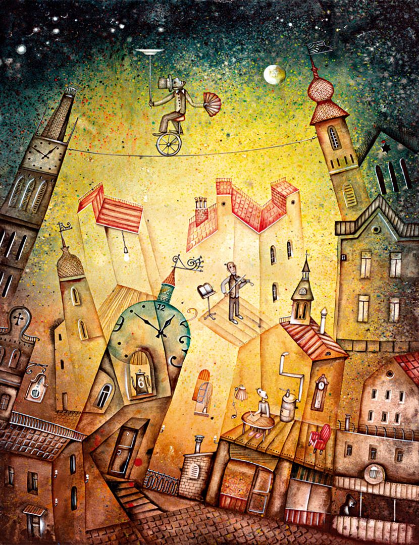 Рисунка, която ни пренася във фантастичен град от приказките, където между две кули минава въжеиграчът и носи радост на децата. Дизайн, провокиращ детското въображение.