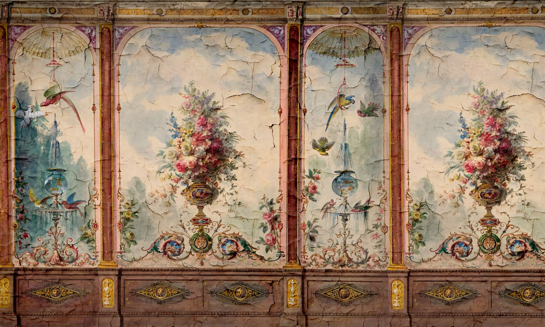 Винтидж тапет с ваза, птици и златни рибки от средата на 19 век създава носталгично усещане и наслада от тази непреходна изисканост.
